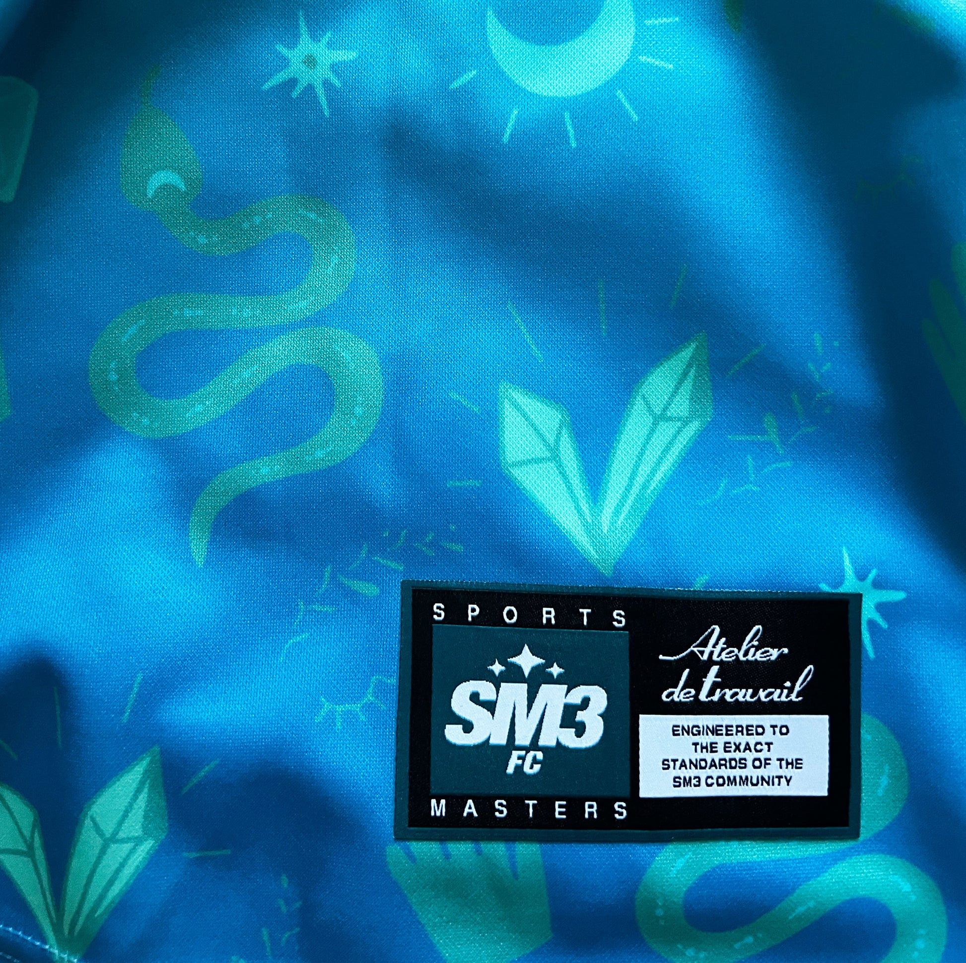 You get spiritual symbols flowing across turquoise waters. Snakes, hands, crescents, and sacred geometry create patterns that speak to something deeper than football.